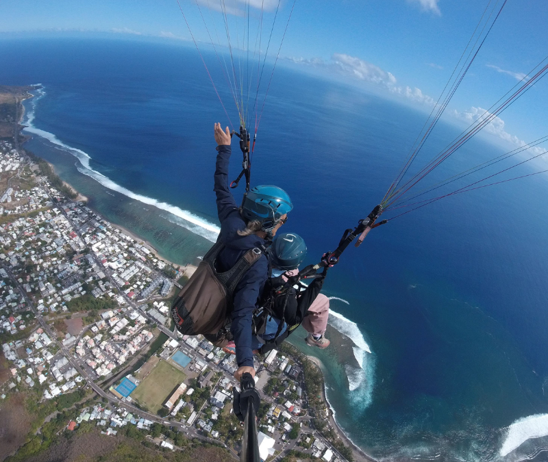 À Saint-Leu, le décollage s’effectue depuis les hauteurs des Colimaçons, à environ 800 mètres d’altitude. Après quelques pas sur une pente douce, vous quittez le sol naturellement pour vous retrouver suspendu entre ciel et océan.